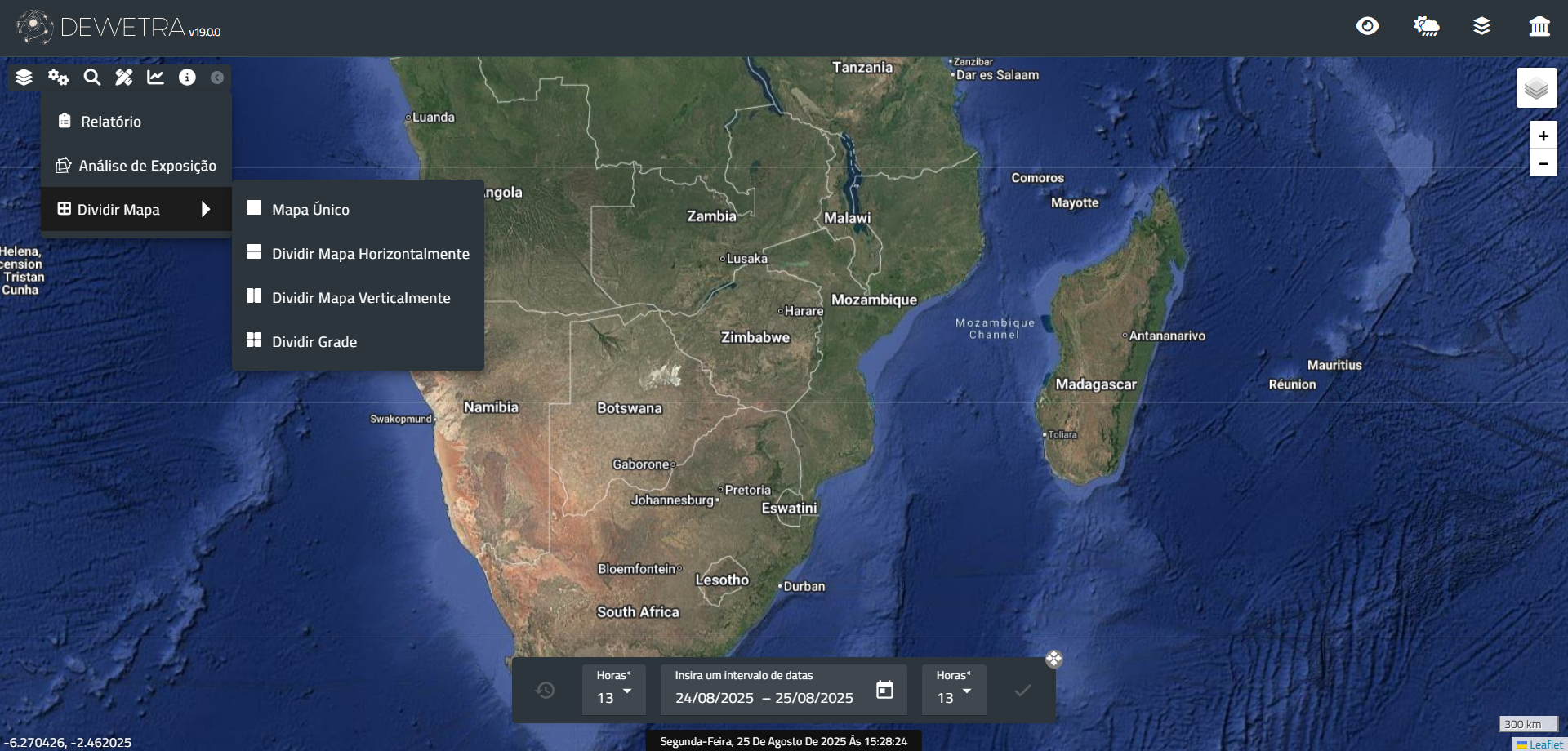 Clicando no botão “Dividir Mapa” é possivel definir quantos mapas podemos observar na tela. As opções disponíveis são: Mapa único, Dividir Mapa Horizontalmente, Dividir Mapa Verticalmente e Divisão em Grade (veja a figura abaixo). Nota que o “Mapa Unico” é a visualização padrão do Dewetra.