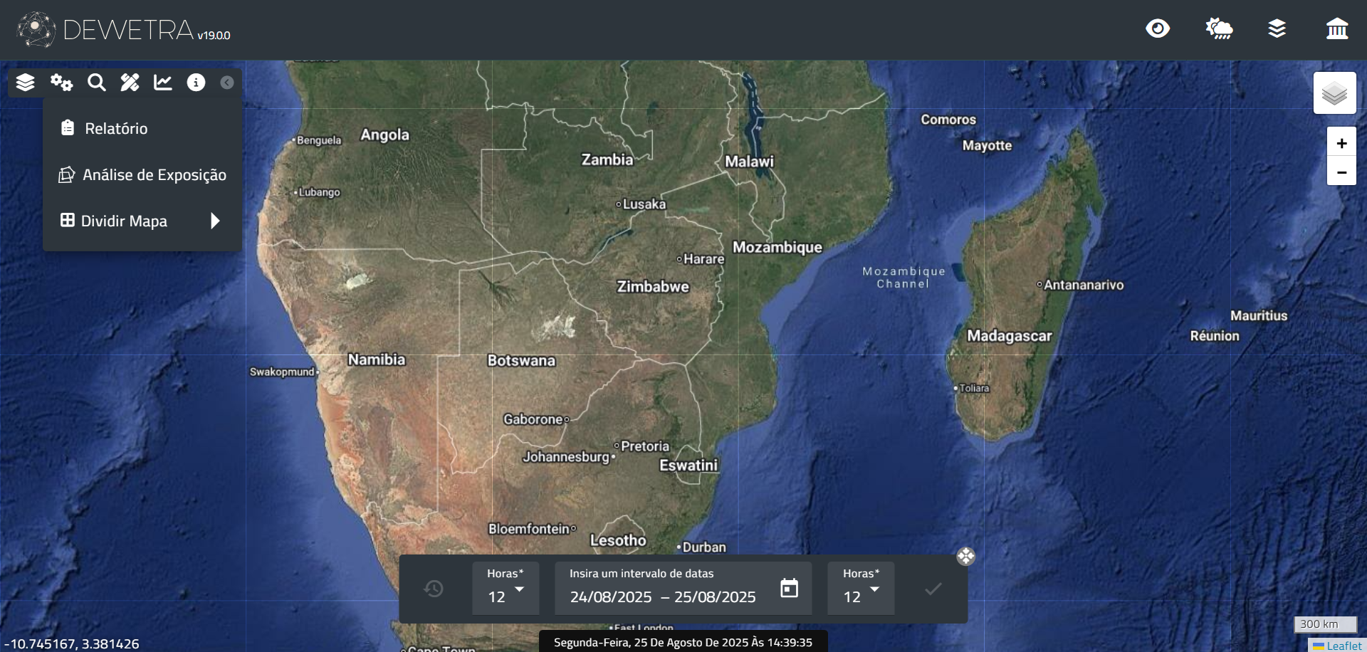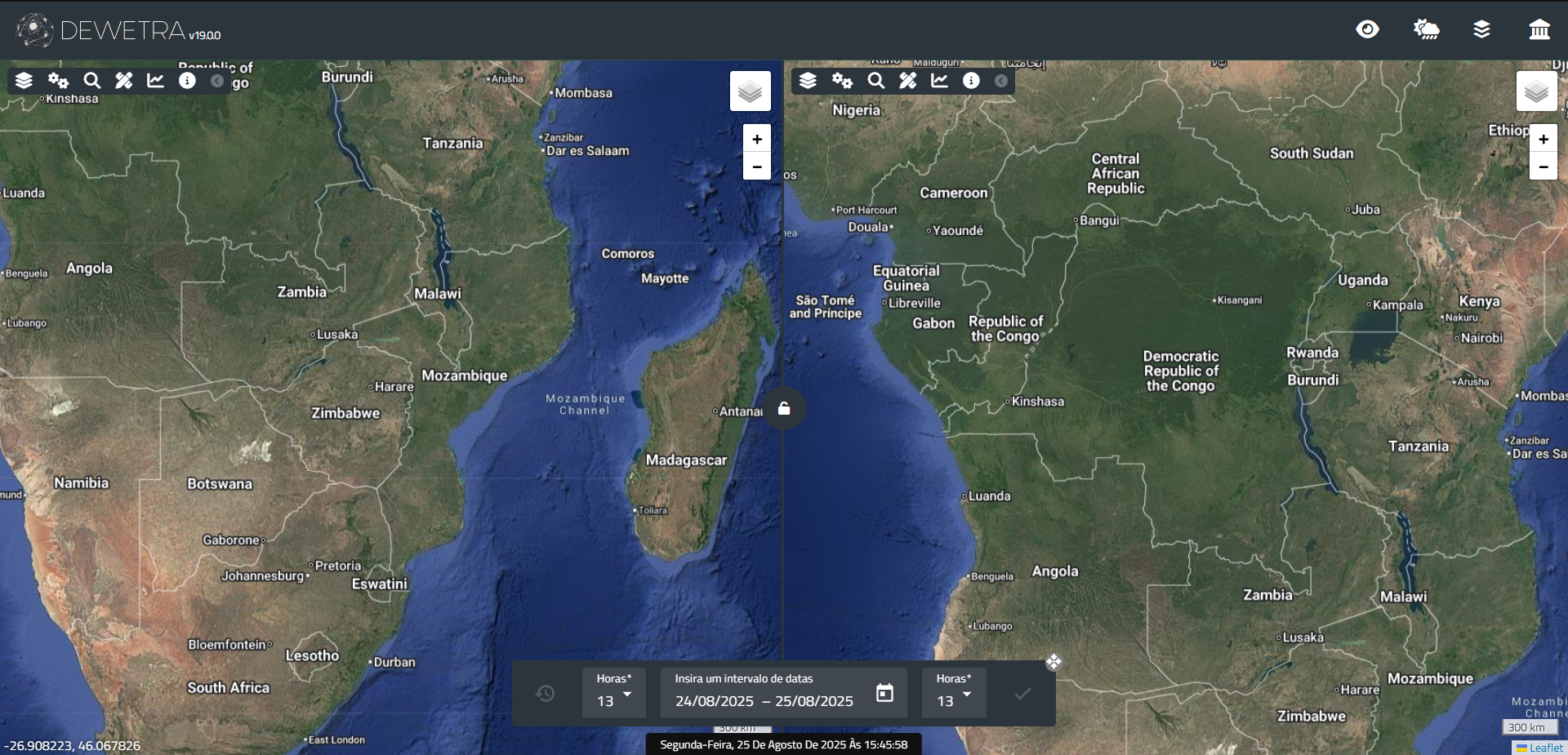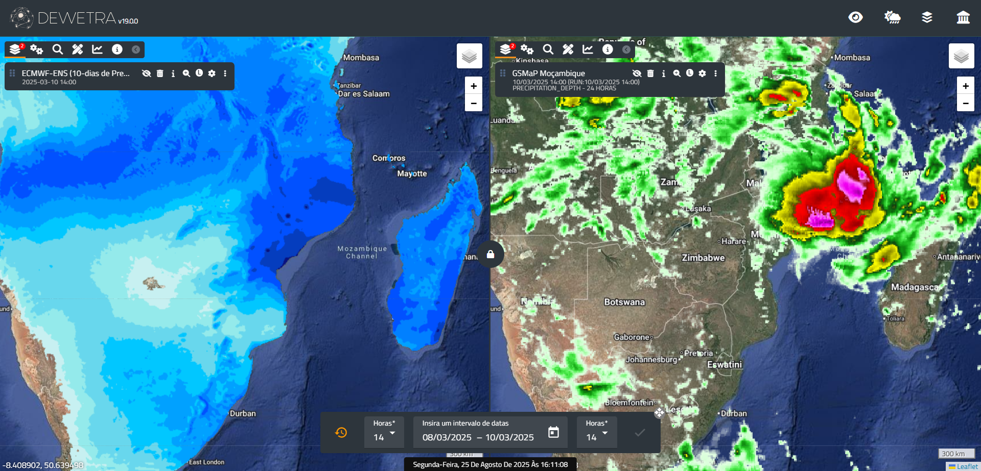 Por exemplo, na figura acima foi selecionado o modelo ECMWF-ENS e GSMAP Moçambique, porém o ECMWF-ENS apenas aparece no lado esquerdo da tela e o GSMAP Moçambique aparece no lado direito da tela. É possível notar também que pelo facto de o cadeado estar “trancado”, o lado esquerdo da tela está centrado no mesmo local que no lado direito da tela, nesse caso Moçambique.