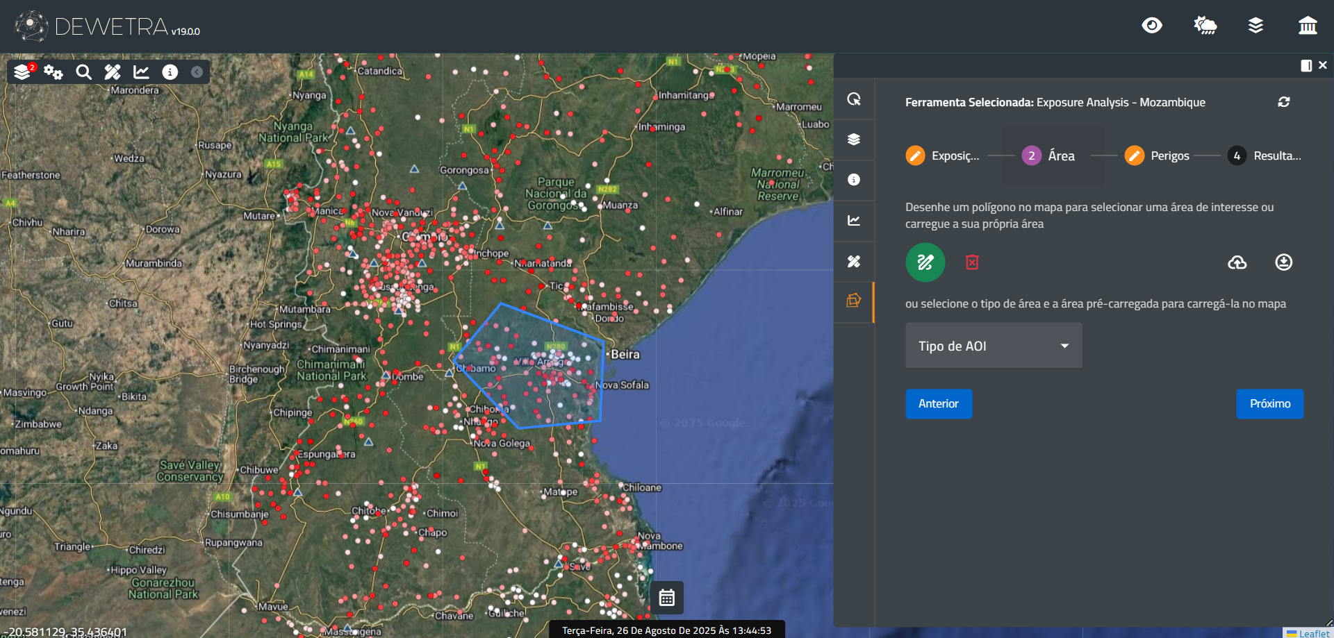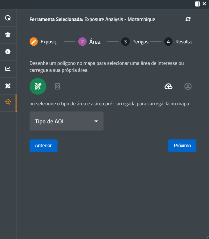Para desenhar a área de interesse manualmente, o usuário deve selecionar o botão verde com icone de “lapis”, e com o botão esquerdo posicionamos o cursor sobre o mapa para definir o ponto inicial do polígono e assim desenhar a área de interesse: para completar o AOI, o último ponto e o inicial devem coincidir (ou seja, o usuário deve clicar novamente no ponto inicial). Em seguida, é possível passar para a próxima etapa clicando em "Próximo".