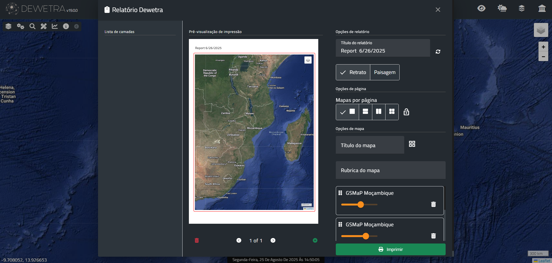 Uma funcionalidade adicional também fornecidos pela ferramenta de relatório do dewetra é poder adicionar várias páginas apenas clicando no botão verde com ícone “+” abaixo do relatório. Ao cliclar no botão, o número de paginas aumenta de um para dois, de pois para 3, assim sucessivamente. No fim podemos exportar todos dos mapas clicando novamente no botão imprimir.